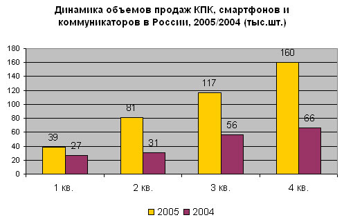 В целом, сектор беспроводных информационных устройств демонстрировал положительную динамику развития, существенно опередив результаты аналогичного периода прошлого года. По данным SmartMarketing, общий объем продаж КПК, смартфонов и коммуникаторов на российском рынке составил 397000 штук. Рост, по отношению к показателю 2004 г. (180000 шт.) составил, таким образом, 120,6 %.