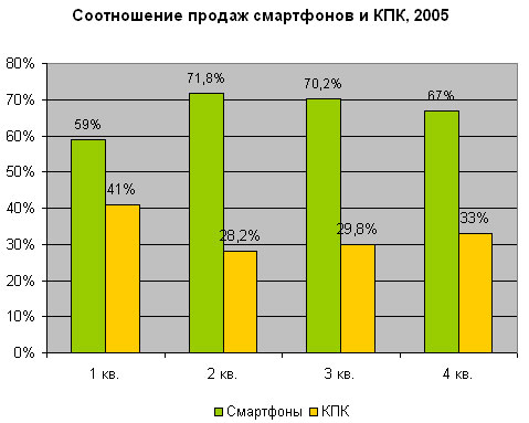 Соотношение долей рынка смартфонов и КПК по итогам года составило 68,1 % и 31,9 %, соответственно. Квартальная динамика показывала доминирование смартфонов и коммуникаторов в течение всех кварталов. Некоторое снижение покупательской активности и изменение соотношения долей смартфонов и КПК в четвертом квартале обуславливается сбоями в поставках ряда моделей, популярных в России модификаций.
