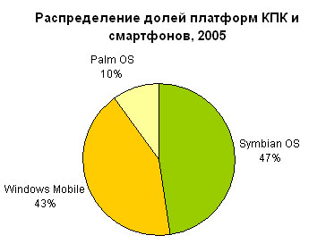 Динамика изменения товарной структуры рынка обусловила изменение в расстановке сил в разрезе платформ. Доминировали в 2005 г. поставки устройств на Symbian OS (47,4 %) и Windows Mobile (42,7 %). Доля PalmOS составила 9,9 %