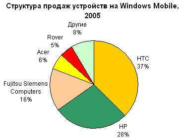 В совокупном объеме продаж за 2005 г в сегменте Windows Mobile доминируют устройства семейства HTC (с долей 37,4 %). Второе место в первой пятерке занимает HP (с долей 27,5 %), третье — Fujitsu Siemens Computers (с долей 16 %). За ними идут Acer (с долей 5,8 %) и Rover (с долей 4,9 %). В целом, на долю пяти ведущих брендов приходится 91,6 % этого рынка.