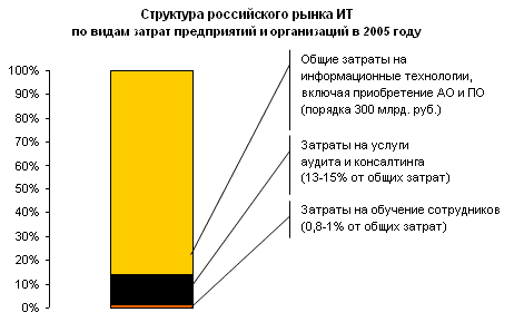 По оценкам CNА, российский ИТ-рынок в 2005 году вплотную приблизился к отметке в 300 млрд.руб. Примерно 250 млрд. руб. было потрачено на закупку нового программного обеспечения и аппаратных средств, около 46 млрд. руб. израсходовано на оплату услуг ИТ-аудита и ИТ-консалтинга и, наконец, немногим менее 3 млрд.руб. предприятия и организации инвестировали в повышение квалификации своих сотрудников в сфере ИТ (ИТ-обучение).
