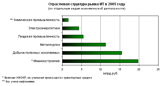 Однако фундаментом рынка продолжает оставаться отечественная промышленность. Отечественные машиностроительные предприятия держат довольно высокую планку самых наукоемких и ИТ-емких отраслей. То, что в России машиностроение фактически монопольно представляет сектор наукоемких производств — известный факт. К этому добавляется и еще одно достоинство — машиностроение, безусловно, лидирует и по индексу ИТ-емкости (0,85 %). В машиностроении этот показатель не просто выше, чем в любой другой отрасли промышленности (скажем, в нефтегазовом секторе она составляет немногим более 0,5 %, в металлургии — 0,54 %), но и выше, чем в целом в экономике (порядка 0,7 %). Таким образом, на рынке ИТ машиностроение, и по итогам 2005 года, остается одним из самых активных игроков.
