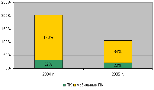 Темпы роста рынка ПК в 2005 году снизились до 22 % против 32 % в 2004 году. Данный результат соответствует ранее сделанным прогнозам. В прошлогоднем отчете указывалась цифра в 6,5 млн шт. По темпам роста и объемам продаж рынка ПК Россия уже второй год входит в первую пятерку стран региона EMEA, вплотную приблизившись к Италии.