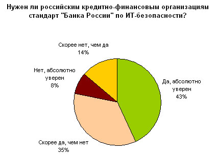 Следует отметить, что против нового стандарта «Банка России» высказались 22 %, среди которых 8 % абсолютно уверены в выбранном варианте, а 14 % остановились на ответе «скорее нет, чем да». По мнению экспертов Банкир.Ру, такая точка зрения может мотивироваться убеждением, что реализация положений стандарта СТО БР ИББС-1.0-2006 потребует отвлечения большого количества ресурсов с критических направлений деятельности компании. Другими словами, существенная доля банков (22 %) опасается, что соответствие стандарту будет стоить слишком дорого. Наиболее вероятно появление данной точки зрения среди малых и микро-банков, которые не могут воспользоваться эффектом масштаба при построении эффективной системы управления ИТ-безопасностью. К тому же подобные организации фокусируются на внутрироссийских операциях и не имеют серьезных перспектив для выхода на мировой рынок.
