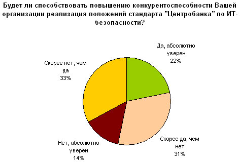 Далее респондентам было предложено сравнить конкурентоспособность организаций, реализовавших положения стандарта СТО БР ИББС-1.0-2006 и не сделавших этого. Большая часть опрошенных (53 %) указала, что совместимые со стандартом «Центробанка» кредитные организации имеют преимущество перед «несовместимыми». В пользу этой точки зрения высказалось на 6 % больше, чем в пользу противоположной. Причем, как и в случае предыдущего вопроса, структура ответов оказалась неоднородной: 22 % абсолютно уверено в своем ответе, а 31 % выбрали вариант «скорее да, чем нет».