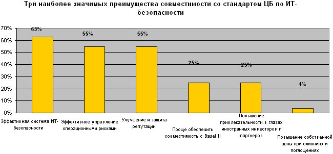 Наиболее популярными среди респондентов оказались следующие три стимула: эффективная система ИТ-безопасности (63 %), эффективное управление операционными рисками (55 %) и улучшение и защита репутации (55 %). Меньше голосов набрали факторы совместимости с соглашением BaselII (25 %), а также повышения привлекательности в глазах иностранных инвесторов (25 %). Наконец, минимальная доля ответов пришлась на фактор повышения собственной цены при слияниях и поглощениях (4 %).