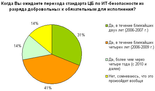 Большинство российских кредитно-финансовых организаций (72 %) в краткосрочной перспективе ожидают трансформации рекомендательного характера стандарта «Банка России» в обязательный. Более того, почти одна треть всех банков (31 %) уверена, что это произойдет уже в 2006-2007 годах. Таким образом, у отечественных кредитно-финансовых организаций появляется еще одна причина обеспечить совместимость со стандартом ЦБ по ИТ-безопасности: в ближайшем будущем это, судя по всему, придется сделать всем и каждому.