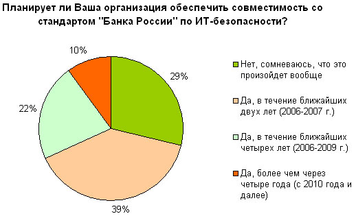 Более половины российских банков (61 %) планируют реализовать стандарт Банка России в своей организации уже в течение ближайших четырех лет. Причем более одной трети респондентов (39 %) собираются это сделать уже в 2006-2007 гг.