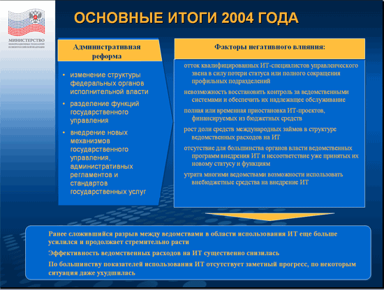 Следует обратить особое внимание на снижение уровня координации и распыления целей в сфере использования информационных технологий. Количество комплексных программ информатизации сократилось. В настоящее время не более половины ведомств имеют подобные программы. Программы зачастую не полностью соответствуют положениям концепции использования информационных технологий в деятельности федеральных органов государственной власти. По-прежнему, в текущем году наблюдается дублирование при создании государственных информационных ресурсов и систем.