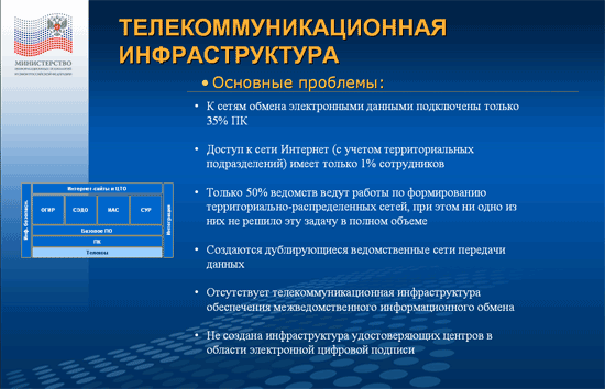 Более того, только половина министерств и ведомств ведут работы по формированию территориально-распределенных сетей. И ни одним из них эта задача не решается комплексно. По-прежнему работы по созданию ведомственных сетей передачи данных дублируются. К сетям обмена электронными данными подключены только тридцать пять процентов персональных компьютеров.