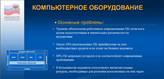В целом по итогам 2004 года уровень обеспеченности федеральных органов власти компьютерным оборудованием несколько повысился. Однако уровень обеспечения работников современным оборудованием остается низким и значительно различается по ведомствам. Тридцать процентов компьютеров морально устарели и не соответствуют современным требованиям. В связи с отсутствием достаточного объема финансирования, около 20% используемой техники приобретено из внебюджетных источников и не стоит на балансе ведомств. Кроме того, в большинстве федеральных органах власти отсутствуют вычислительные ресурсы, необходимые для решения более сложных задач.