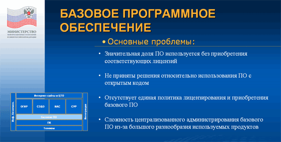 В области обеспечения федеральных органов власти базовым программным обеспечением основные проблемы по-прежнему связаны с вопросами использования лицензионного программного обеспечения. Значительная доля программного обеспечения используется без приобретения соответствующих лицензий. Отсутствует единая политика лицензирования и приобретения базового программного обеспечения. До настоящего времени не приняты решения относительно использования программного обеспечения с открытым кодом. В ведомствах наблюдается большая разрозненность используемых продуктовых линеек, что приводит к невозможности централизованного администрирования базового программного обеспечения.
