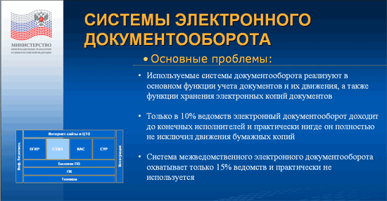 Практически все ведомства используют в своей деятельности специализированные автоматизированные системы, обеспечивающие возможность ведения централизованного учета и регистрации входящей и исходящей корреспонденции. И только немногие из созданных систем охватывают все задачи документооборота. При этом только в десяти процентах ведомств электронный документооборот охватывает значительную долю рабочих мест сотрудников. Документы по-прежнему ходят в бумажном виде.
