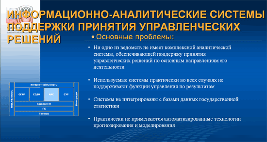 Ситуация усугубляется отсутствием в федеральных органах власти комплексных информационно-аналитических систем поддержки принятия управленческих решений. Практически не используются технологии прогнозирования и моделирования ситуаций, автоматизированного сбора структурированных данных, их обработки и общего анализа. Такие возможности существуют только у двадцати процентов министерств и ведомств.
