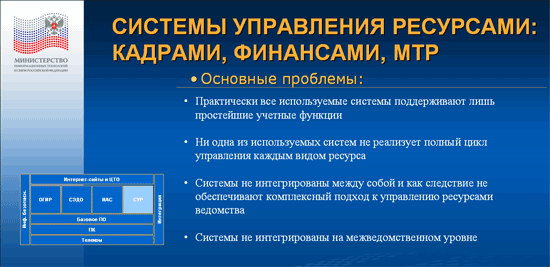 Аналогичная ситуация и с внедрением специализированных систем по управлению финансами и кадрами. Большинство ведомств используют автоматизированные системы бухгалтерского и финансового учета. При этом практически все из них не увязаны на межведомственном уровне с автоматизированной информационной системой «Финансы», используемой для управления подготовкой и исполнением федерального бюджета.
