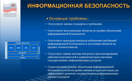 На федеральном уровне отсутствуют единые стандарты и требования к информационной безопасности, а также процедура контроля соблюдения этих требований и аттестация объектов на предмет соответствия.