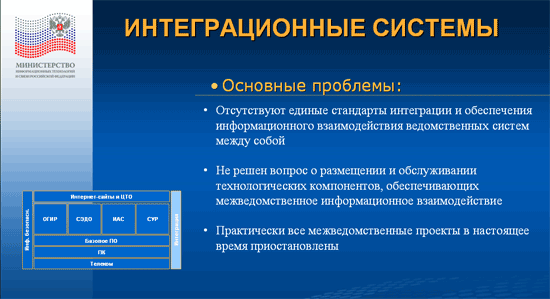 В части интеграции ведомственных систем и формирования межведомственных государственных ресурсов в настоящее время практически все проекты в данной области приостановлены.