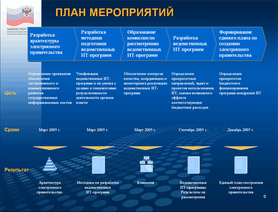 Для выработки комплексного подхода Мининформсвязи России была разработана концепция использования информационных технологий в деятельности федеральных органов государственной власти до 2010 года, которая была одобрена Правительством в сентябре этого года.