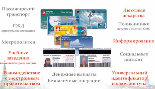 В первую очередь по программам социальных карт стали обслуживаться льготные категории граждан. При этом были решены такие задачи, как целевое адресное предоставление льгот, учет предоставленных льгот, автоматизация обслуживания льготных категорий населения, ведение Единого реестра социальных льготников и другие. Социальные карты уже широко используются для обслуживания льготных категорий граждан на предприятиях потребительского рынка и услуг (в организациях розничной торговли, сервиса, общественного питания), в аптеках в соответствии с установленным порядком. Также их держатели могут на льготной основе обслуживаться в лечебно-профилактических учреждениях, входящих в систему обязательного медицинского страхования, а при необходимости — и в других медицинских организациях, а также в аптечных пунктах при выдаче лекарств на бесплатной основе. В лечебно-профилактических учреждениях внедряются устройства для считывания информации с социальных карт в целях их приема наравне с полисами обязательного медицинского страхования. Социальные карты обеспечивают льготный проезд в общественном транспорте. Действие карт распространяется на метрополитен, автобус, троллейбус, трамвай и пригородное сообщение по железной дороге. Применение социальной карты в Московском метрополитене Источник: ГУП «Московский социальный регистр» Социальная карта для проезда на транспорте служит подтверждением льгот ее владельца. Она снабжена встроенным микрочипом, который несет в себе информацию о транспортных приложениях (их может быть несколько). С помощью социальной бесконтактной пластиковой карты пассажир может осуществлять пригородные поездки на электричках, пользоваться метро, железной дорогой и общественным наземным транспортом. Турникеты пропускают обладателя бесконтактной чиповой карты, фиксируя его проход, при этом бесконтактный способ считывания информации позволяет более оперативно осуществлять пропуск пассажиров по сравнению с обыкновенными картами с магнитной полосой. В результате автоматизируется учет количества перевозимых льготников. Еще одно достоинство бесконтактных чиповых карт — высокая степень защиты от подделки. На настоящее время не было зафиксировано ни одного случая нарушения подлинности транспортной карты, в то время как ранее вопрос фальсификации проездных документов был очень актуальным. Системы на основе электронных транспортных карт уже запущены в Москве, Риге, Вильнюсе, на двух железных дорогах России. Ожидается, что Горьковская железная дорога в ближайшем будущем тоже перейдет на пластиковые бесконтактные карты оплаты. Установлено необходимое оборудование для перехода на социальные карты и на казанском пригородном вокзале. В настоящее время разработана автоматическая система оплаты и регистрации проезда на городском и пригородном общественном пассажирском транспорте (автобус, трамвай, троллейбус, маршрутное такси). Это недорогое решение по оборудованию подвижного состава специализированными терминалами для приема платежей за проезд наличными средствами или с использованием бесконтактных чиповых карт, которое позволяет отслеживать и маршрут, и даже отдельный автобус, перевозящий льготных пассажиров. Подобный проект реализован на маршруте Калининград — Светлый. Таким образ