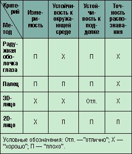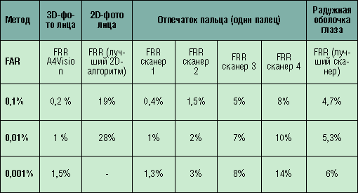 Данные, приведенные в таблице свидетельствуют что сравнимой точностью обладают три метода биометрической идентификации, а именно: по отпечатку пальца, по трехмерному изображению лица и по радужной оболочке глаза. Распознавание по двумерному изображению лица уступает перечисленным методам по точности на порядок, но наиболее удобно для визуального сравнения оператором фотографии в паспорте с личностью его владельца.