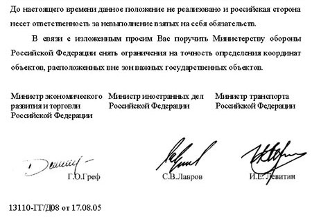 Об этом свидетельствуют заблудившийся и потерянный в Литве истребитель, пригвожденный строителями поезд в московском метро – в этих и во многих других случаях и огромные, никем еще не подсчитанные убытки, которые несет российская промышленность. Ситуация усугубляется тем, что правительство даже при обсуждении связанных с геоданными вопросов старательно обходит наиболее важные из них. Появление Google Earth наглядно продемонстрировало уровень расхождений между технологическими реалиями сегодняшнего дня и представлением о них, зафиксированным в законодательных актах. Непрерывный рост доступности космических снимков и других типов геоданных, появление новых областей их применения и непрерывное снижение стоимости вполне закономерно привело к тому, что однажды эти снимки появились в открытом доступе совершенно бесплатно. Этот момент застал Россию врасплох. Только Роскартография отозвалась на появление сервиса maps.google.com специальным заявлением, в котором указала, что половина карт и 90% навигационных систем, поступающих на российский рынок, — это подделки. «Содержание этих материалов никто не контролирует, поэтому трудно предугадать, куда эти карты заведут», — отмечалось в заявлении. В этих словах содержалась изрядная доля лукавства – отсутствие качественных и достоверных карт в России, как неоднократно отмечалось представителями ГИС-Ассоциации, уже опустилось ниже опасной черты. Были бы карты, не стало бы «подделок». Обеспечь Роскартография рынок качественной и актуальной продукцией, речь о «подделках» не пришлось бы вести. Нетерпимость такого положения вещей была быстро осознана в правительстве. 17 августа 2005 года, два месяца спустя после появления ресурса Google Earth, руководители трех министерств обратились к президенту Владимиру Путину с предложением «поручить Министерству обороны Российской Федерации снять ограничения на точность определения координат объектов, расположенных вне зон важных государственных объектов». Подобное обращение министров непосредственно к самому президенту по данному вопросу по-своему беспрецедентно. Конфликт «гражданских» и «силовых» министерств перешел в новое качество. Фрагмент «письма трех министров» Источник: ГИС-Ассоциация Министры экономического развития и торговли, иностранных дел и транспорта обратились непосредственно к президенту Путину с предложением отменить режим ограничения предельной точности определения координат объектов на местности. Сами эти ограничения были названы «необоснованными». Помимо очевидных убытков в экономической сфере, данный режим препятствует выполнению Российской Федерацией взятых ею самой обязательств в рамках международных договоров, указывалось в письме. Спутниковая навигация давно стала международным стандартом, и этот факт зафиксирован, в частности, в международных соглашениях, обеспечивающих безопасность движения морских и воздушных судов. Так, международные организации гражданской авиации (ИКАО) и морского флота (ИМО) требуют обязательного использования систем спутникового позиционирования на воздушных и морских судах. «До настоящего времени, — говорится в письме трех министров, — данное положение не реализовано и российская сторона несет ответственность за невыполнение взятых на себя обязательств». Более того – целы