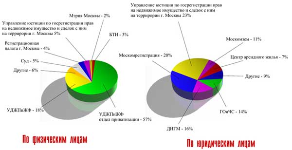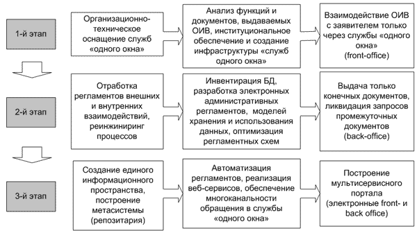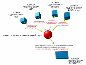 Специалисты служб «одного окна» начинают принимать документы от заявителей по методу индукции (от простых к сложным). На этом этапе обеспечивается выдача большинства исходящих документов органов исполнительной власти через «одно окно», хотя еще нельзя сказать, что органы исполнительной власти окончательно перешли на режим «одного окна», т.к. для того чтобы получить необходимый документ, заявитель вынужден обойти целый ряд «окон», собрать необходимое количество промежуточных документов и уже только после этого обратиться в то «одно окно», которое выдаст ему конечный документ. Этапы реализации режима «одного окна» (рис. 2) Так, например, в Зеленограде оказалось, что в настоящий момент отсутствует предмет напряженного внешнего взаимодействия, несмотря на то, что формально префектура принимает конечный документ по многим вопросам. Напр., по инвестиционным объектам, проект распоряжения префекта готовит Территориальное отделение регулирования землепользования Москомзема, а для его подготовки в свою очередь требуется множество заключений от служб «одного окна» других организаций (Инспекция государственного строительного надзора, Москомархитеатура, Департамент природопользования и охраны окружающей среды, Роспотребнадзор и др.). Таким образом, для оформления Оформления земельно-имущественных прав через обращения в службы «одного окна» (рис.3) На втором этапе осуществляется отработка регламентов внешних и внутренних взаимодействия службы «одного окна» (фокус на обеспечении Одновременно с этим ведутся работы по налаживанию и оптимизации каналов обмена данными, как внутри самой организации, так и с внешними организациями с применением технологии электронного документооборота и средств На этом этапе осуществляется проектирование информационной системы, представляющей собой реляционную базу данных, обеспечивающую информационное взаимодействие между органами исполнительной власти по определенным алгоритмам, на основе единых принципов и общих правил. В настоящее время у большинства держателей «одного окна», уже существуют локальные базы данных и электронные архивы, содержащие достоверную информацию, необходимую при реализации режима «одного окна». В связи с этим, необходимо провести инвентаризацию и анализ всех держателей «одного окна», на предмет наличия указанных баз и архивов. Целью данного анализа является последующая интеграция локальных ресурсов в единое информационное пространство, а также оптимизация процессов и хранилищ информации путем исключения дублирования данных отдельными локальными базами и электронными архивами и выявление потребности в создании дополнительных информационных систем. Например, при внедрении режима «одного окна» в префектуре Зеленограда оказалось, что многие документы, выдаваемые в режиме «одного окна», являются промежуточными. В частности, анализ организаций, для представления в которые запрашивались распоряжение префекта, показал, что потребитель более половины из них — Управление Департамента жилищной политики и жилищного фонда. После разработки и утверждения соответствующего регламента взаимодействия, непосредственно УДЖПиЖФ запрашивает и получает в службе «одного окна» префектуры необходимое распоряжение, без привлечения к этому процессу заявителя. П