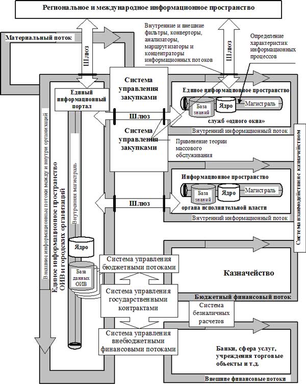 Для описания и построения модели управления ресурсопотоками «одного окна» лучше всего использовать понятия из области информатики и логистики, применяемые при построении систем управления сетевыми потоками. Именно они наиболее четко и детально позволяют описать все тонкости создаваемой модели. Так, например точки входа/выхода информации в систему (обмен данными служб «одного окна» с внешним и внутренним информационными пространствами) соответствуют понятию шлюза. Обмен данными, между потоками, за пределами проектируемой системы, может осуществляться через мосты (бухгалтерия и т.п.). Элементы системы, отвечающие за преобразование информации из одной формы в другую, называются конверторами. Узлы, отвечающие за анализ входящей/исходящей информации условно обозначим анализаторами, а определяющие дальнейшее направление движения потока информации в системе маршрутизаторами. Таковыми узлами могут являться как специалисты службы «одного окна», так и программы, направляющие письма в ту или иную организацию или информационное хранилище. Фильтр — элемент информационной системы, отсеивающий информацию по определенным критериям или в соответствии с определенным набором правил. В частных случаях, в роли фильтра, может выступать анализатор. Например, в системе таможенного «одного окна» применяется схема с таможенным брокером для фильтрации тех, кто получает право электронного декларирования. Участник ВЭД передает по электронной почте все необходимые документы таможенному брокеру (посреднику или представителю, имеющему право совершать таможенные операции от имени и по поручению декларанта). Брокер, получив от грузоотправителя документы, начинает формировать электронную таможенную декларацию, заверяет ее электронно-цифровой печатью (подписью) и отправляет на сервер таможни. Если возникают вопросы, общение между брокером и таможней ведется посредством электронных каналов связи. Инспектор проверяет декларацию, производит выкладку и после того, как декларация выпущена, отправляет в электронном виде все документы таможенному брокеру. Таможенное оформление завершено. Груз выпущен, машина ушла в сторону границы. Указанные выше элементы функционируют в рамках единой информационной системы (информационного пространства), обеспечивающей сбор, обработку, формирование и выдачу информации. При построении модели, в качестве примера, возьмем процессы, протекающие в службе «одного окна» префектуры города Москвы. По отношению к данной службе «одного окна», все остальные держатели «одного окна» и городские организации будут являться внешними информационными потоками, функционирующими в едином информационном пространстве. Итак, информация, через шлюз, попадает из внешней среды во внутренний информационный поток службы «одного окна», пройдя через ряд анализаторов, фильтров, конверторов, концентраторов, маршрутизаторов и т.д., где она подвергается обработке. Далее обработанная информация из «одного окна», маршрутизатором, через шлюз, направляется либо во внешнюю среду (в виде ответа заявителю), либо попадает во внешнее информационное пространство органов исполнительной власти и городских организаций (в виде различных запросов на согласование). В зависимости от типа и рода информации из информационного потока органов и