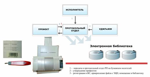 Распоряжением префекта утверждены Регламенты взаимодействия служб «одного окна» префектуры и управ районов с организациями, имеющими наиболее интенсивный документооборот в процессах подготовки конечного документа для заявителя. В префектуре и управах районов округа идет экспериментальная отработка схемы электронного документооборота при реализации режима «одного окна». Отрабатывается подготовка запросов на получение заключений и согласований городских организаций и передача документов ответственным исполнителям префектуры с использованием электронно-цифровой подписи. Всего в префектуре в соответствии с договором с «Мосжилрегистрацией» 60 сотрудников — владельцев ЭЦП. Разработанные регламенты позволяет осуществить получение промежуточного документа, каким является копия распоряжения префекта, без участия заявителя. Регламент предусматривает использование для оптимизации этого процесса технологии электронного документооборота и средств электронно-цифровой подписи. Для обеспечения такого процесса в префектуре создается электронная библиотека распоряжений префекта (рис.9). Такая база позволит передавать легитимные распоряжения префекта для проведения согласований, а также для обеспечения выдачи документа заявителю в момент обращения. Для создания электронной базы в настоящее время проводится залповый ввод распоряжений префекта принятых в 2003-2004 годах. Для новых распоряжений префекта налажена работа по помещению копий распоряжений, подписанных электронно-цифровой подписью с помощью технологии поточного сканирования.