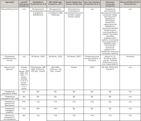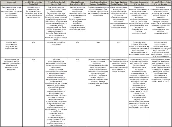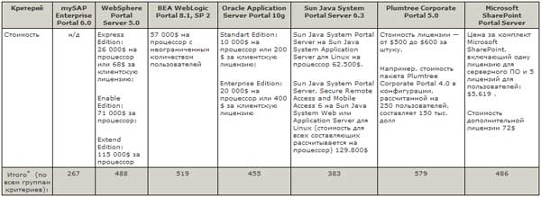 В сравнительном анализе портальных решений, проведенном компанией «РБК СОФТ», были рассмотрены основные платформы: Microsoft SharePoint Portal Server 2003, Oracle9iAS Portal, IBM WebSphere Portal, Sun Java System Portal Server, Plumtree Corporate Portal, BEA WebLogic Portal. Основные результаты представлены в сравнительной таблице ключевых критериев по следующим направлениям: функциональные требования, общие требования к архитектуре и требования к организационному обеспечению. Каждому приведенному в таблице критерию присвоен вес, определенный экспертами компании "РБК СОФТ". Итоговая оценка по каждой из групп критериев, приведенная в таблице, представляет собой среднее арифметическое значение и получена путем деления суммарного балла по данному критерию на число критериев.