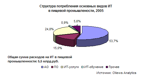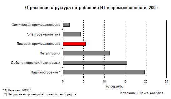 Пищевая промышленность замыкает четверку лидеров в потреблении ИТ. Несмотря на свое скромное место в рейтинге, российские пищевые предприятия обходят по затратам на ИТ и химическую промышленность, имеющую, хоть и невысокий, но все же ощутимый, экспортный потенциал, и даже энергетику, в которой одно только РАО ЕЭС чего стоит!