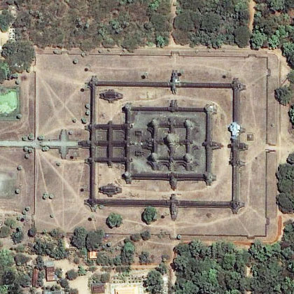 Появилась возможность увидеть нашу планету или любой ее фрагмент целиком, такой как она есть, не опосредованной символикой географических карт. Будучи еще недавно «роскошью», доступной лишь немногим, космические снимки в последние годы прочно заняли место важнейшего источника географической информации и неотъемлемого компонента современных геоинформационных систем любого класса и назначения. Это стало возможным благодаря появлению космических аппаратов коммерческого назначения и рынка космических снимков, на котором любой желающий (если тому не препятствуют особенности национального законодательства) может приобрести снимки нужной территории с известными и стабильными характеристиками. Космический снимок храмового комплекса Агнкор-Ват, Кампучия.