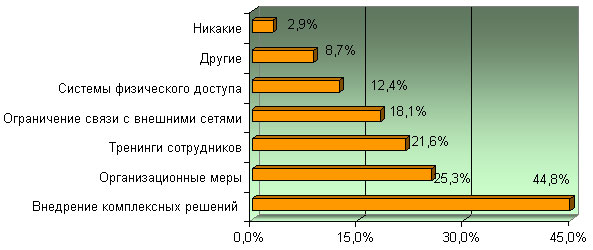 Наиболее эффективным средством являются комплексные информационные продукты (44,8 %). Эта мера лидирует вот уже на протяжении трех лет, поэтому можно смело утверждать, что именно в этом направлении будет происходить наибольший рост рынка внутренней ИБ в ближайшие годы.