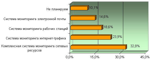 Наибольшим вниманием респондентов пользуются комплексные решения (32,8 %), средства мониторинга интернет-трафика (23,9 %) и системы мониторинга рабочих станций (18,6 %). Замыкает цепочку лидеров система мониторинга электронной почты (14,6 %). Ее некоторое запоздание может объясняться тем, что часть организаций уже использует фильтры исходящих сообщений.