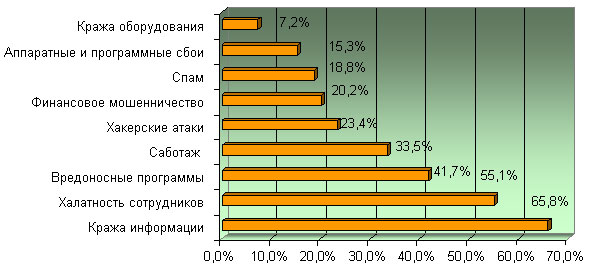По сравнению с прошлым годом несколько изменился ландшафт самых опасных угроз ИБ. На первом месте по-прежнему остается кража информации (65,8 %). Ее индекс опасности подрос на 1,8 % по сравнению с 2005 годом и на 3,8 % по сравнению с 2004 годом. На втором месте оказалась халатность сотрудников (55,1 %). Этого варианта ответа не было в прошлогоднем исследовании, поэтому не представляется возможным проследить за динамикой изменения индекса опасности этой угрозы. Тем не менее, уже сейчас можно сделать ряд выводов. Например, вирусные атаки заняли лишь третье место, набрав 41,7 % голосов. Если сравнивать с 2005 годом, то эта угроза потеряла целых 7,3 процентных пункта, а если с 2004 годом — то сразу 18,3 %. Вероятно, именно этот рейтинг опасности позволил такой угрозе, как халатность сотрудников, сразу же занять второе место в списке самых опасных угроз ИБ.