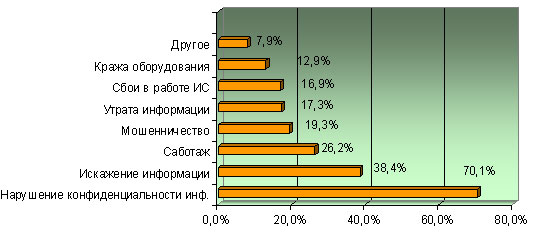 Между тем, индекс опасности этой угрозой в 2005 году достигал 100 %, а в 2004 году — 98 %. На первый взгляд, может показаться, что обеспокоенность респондентов утечкой конфиденциальной информации за 2006 год несколько снизилась, однако внимательный анализ обнаруживает, что это не так. Прежде всего, в варианты ответов были добавлены две новые угрозы, которые не учитывались в предыдущих исследованиях. Это саботаж (26,2 %) и мошенничество (19,3 %). Легко видеть, что эти риски заняли третье и четвертое место в списке наиболее опасных угроз, так что включение их в опросный лист было совершенно оправданным. С учетом того, что каждый респондент по-прежнему мог выбрать только три варианта ответа, представляется наиболее вероятным, что две новые угрозы оттянули часть голосов с нарушения конфиденциальности на себя.