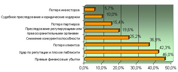 Итак, наиболее опасной угрозой ИБ является утечка конфиденциальной информации, совершаемая инсайдерами. В этом году перед респондентами впервые поставили вопрос относительно наиболее плачевных последствий, возникающих вследствие утечек. Как оказалась, более всего респонденты озабочены прямыми финансовыми убытками (46 %). На втором месте — ухудшение имиджа и общественного мнения (42,3 %), а на третьем — потеря клиентов (36,9 %).