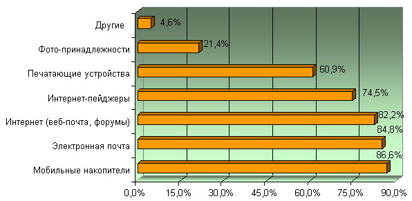 На следующем этапе исследования аналитический центр InfoWatch предложил респондентам указать самые распространенные каналы утечки информации. Распределение ответов представлено ниже. Заметим, что наибольшей популярностью среди инсайдеров пользуются мобильные накопители (86,6 %), электронная почта (84,8 %) и интернет (82,2 %). По сравнению с 2005 годом первые две позиции не поменялись, а вот интернет потеснил с третьего места сетевые пейджеры, который в 2006 году набрали только 74,5 % процентных пункта и заняли четвертое место.