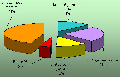 Наконец, одним из самых важных моментов исследования стал вопрос о количестве утечек конфиденциальной информации, которые респонденты допустили в течение 2006 года. Как в 2005 и 2004 годах, лидером оказалось стандартное «Затрудняюсь ответить», так как слишком многие респонденты еще не используют специализированных решений для выявления утечек. Однако положительный сдвиг уже налицо: если в 2004 году затруднения возникли у 67 %, в 2004 году — у 62 %, то в 2006 году уже лишь у 44,8 % всех опрошенных организаций.