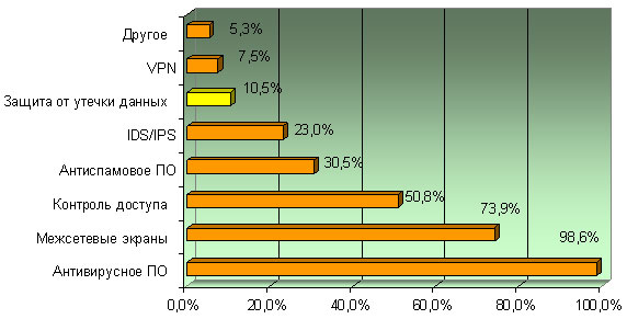 Среди наиболее популярных средств ИБ за последний год не произошли значительных изменений. По-прежнему пальму первенства удерживают антивирусы (98,6 %), межсетевые экраны (73,9 %) и контроль доступа (50,8 %). Сразу отметим, что небольшое снижение индекса использования антивирусных средств (со 100 % до 98,6 %) было неизбежно вследствие существенного расширения базы респондентов. В то же самое время на четвертом месте оказались программы защиты от спама, которые за 2006 год прибавили 13,5 % и достигли отметки 30,5 процентных пунктов.