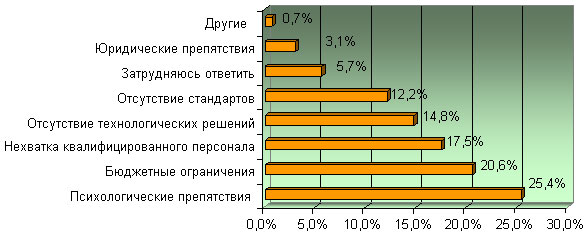 Если говорить о предотвращении утечек, то положительная динамика налицо. Каждая десятая организация уже использует те или иные средства защиты, хотя о по-настоящему массовом внедрении можно говорить в перспективе только ближайших трех лет. Что же мешает бизнесу и госструктурам начать внедрять защиту от утечек прямо сейчас? Оказывается, респонденты психологически не готовы пойти на такой шаг. Правда, девять из десяти планируют установить системы внутренней ИБ уже в ближайшие 2-3 года. Таким образом, тенденция налицо, причем если в прошлом году можно было говорить о ее малых темпах, то сегодня темпы уже впечатляющие: за 2006 год число респондентов, внедривших продукты на основе ИТ, возросло на 500 %.
