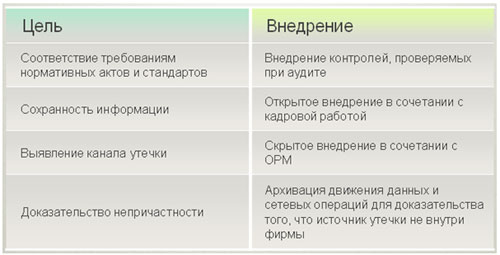 В процессе внедрения системы контроля над конфиденциальной информацией и защиты от инсайдеров шекспировское «to be or not to be» часто перетекает в дискуссию о преимуществах и недостатках технических средств и организационных мер. Аргументация апологетов той или иной позиции, включая дуалистическую, стройна и убедительна. Придраться действительно не к чему. «Зачем нам оргмеры? Так мы просто спугнем нарушителя и упустим возможность воспользоваться мечом правосудия! Надо втихую ставить фильтры и отслеживать инсайдеров!» Так считают приверженцы «К чему тратить сотни тысяч долларов на всякие железяки? Я просто на всех рабочих станциях включу в трее зелененькую штучку и пущу по компании слух, что все теперь под колпаком. А увольняющимся буду давать $100, чтобы они всем говорили, что их выследила «зелененькая штучка» — это реальное мнение сторонника организационных мер. Дуалисты выглядят наиболее убедительными, считая, что необходим комплекс и технических и организационных мер — только так возможно эффективно противостоять внутренним Сложно не согласиться с мнениями всех сторон. Ведь каждый из них решает свои задачи. И поэтому затруднительно признать единую истину — она лежит в каждой аргументации и отталкивается от конкретных целей внедрения. Цели и методика внедрения системы защиты против инсайдеров В зависимости от выбранной цели выбирается и методика внедрения. Соответственно, подыскивается место и насыщенность организационными мерами. Например, для достижения соответствия требованиям национальных и международных нормативных актов и стандартов (таким как стандарт ЦБ РФ, Basel II, К чему все это перечислено? В любом случае, у каждой компании будут возникать свои специфические цели и задачи. Вписать их в простую табличку — слишком самонадеянно. Универсального рецепта, так же как и идеальных условий не бывает. Компаниям придется рассматривать необходимость и объем комплекса организационных мер при внедрении системы защиты от внутренних Организационные меры Прежде всего — еще одна «Нота Бене». Однако, не стоит воспринимать перечисленный ниже комплекс организационных мер как истину в последней инстанции. Надежда на универсальность рецепта может испортить проект сродни эффекту картонного бронежилета. «На Бога надейся, но сам не плошай» — трудно сказать точнее. Компании все равно необходимо самостоятельно принимать решение о выборе и интенсивности тех или иных мер. Вряд ли Психологический фактор Не вдаваясь в психологические аспекты защиты подробно, можно выделить два способа внедрения систем — открытый и закрытый. Как внедрять такую систему — решает сам заказчик, причем на самом высоком уровне. Безусловно, полностью реорганизовать документооборот незаметно для пользователей невозможно, тем более, что часть процесса внедрения — ознакомление пользователей с процедурами доступа. Однако, если основная цель внедрения системы — выявление уже действующего канала утечки, определение всех его звеньев, причем не только исполнителей внутри компании, но и заказчиков информации вне ее, имеет смысл повременить с объявлением процедур и ставить в первую очередь мониторы активности пользователей и контентную фильтрацию почты и Если же внедрять систему защиты от внутренних угроз открыто, то за счет психологического фактор