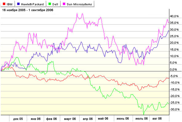 Источник: IDC, 2006 Восстановление после летнего спада Динамика акций компаний за последние 200 дней говорит о высокой устойчивости бумаг IBM на фоне волатильности Котировки акций серверной "четверки" Источник: StockCharts, 2006 Dell, очевидно, страдает от снижения прибыли. Так, за 2 кв. 2006 года компания при общем росте продаж получила прибыль вдвое меньшую, чем год назад (0,5 млрд. долл против 1 млрд. долл., по оценкам IDC). Да и сам рост выручки заметно слабее, чем у конкурентов. HP, наоборот, показывает отличный рост прибыли: с 73 млн. долл. год назад до 1,38 млрд. долл. за последний квартал (данные IDC). Успехи же Sun аналитики объясняют увеличением доли компании на |