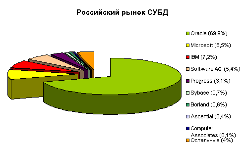 Российский рынок СУБД продолжает расти и динамично развиваться. Так, объём продаж Oracle за 2004-й финансовый год вырос на 50% (в 2005 прогнозируется показатель в 60%). Количество проданных лицензий Microsoft SQL Server за тот же период увеличилось на 53%, а IBM констатирует При том, что работают в России те же игроки, расстановка сил на отечественном рынке несколько отличается от мировой. По данным IDC, 69,9% рынка лицензий и сопровождения СУБД приходится на Oracle. На втором месте Microsoft с 8,5%, а IBM занимает только третье место с 7,2% рынка. Источник: IDC, 2004 Можно предположить, что подобная позиция IBM на российском рынке СУБД объясняется Продукция Microsoft (в первую очередь, Windows, а за ней и MS SQL Server) попала на компьютеры российских пользователей сначала тоже нелегально. Однако в итоге это обеспечило корпорации второе место по продажам СУБД. Вот и борись после этого с компьютерным пиратством. Иностранцы предлагают Oracle предлагает решения в первую очередь для таких отраслей, как авиация и ВПК, автомобилестроение, металлургия, нефтегаз, химическая и пищевая промышленность, транспорт и грузоперевозки, телекоммуникации, финансовые институты и госсектор. СУБД Oracle используют, в частности, «Газпром», Минатом России, АВПК "Cухой", "Штерн Цемент", "Связьинвест", Банк России, Банк Москвы, группа "ИФД КапиталЪ", Сургутнефтегазбанк, ФНС России, ФТС России и др. Microsoft позиционирует свою СУБД, как основу для построения корпоративных хранилищ данных, электронной коммерции и IBM предлагает решения для нефтеперерабатывающей промышленности, энергетического сектора, для банков и финансовых организаций, а также решения в сфере обучения, решения для государственных организаций ( Adabas позиционирует свою СУБД, как наиболее эффективную с точки зрения приведенных затрат при обработке онлайновых деловых транзакций. Среди решений, использующих эту СУБД, «Автоматизированная система сбора, передачи, обработки и отображения технологической информации (АССПООТИ) "Газпром"», разработанная подразделением “ИнформГаз”, «Айтекс-Предприятие» (базовый продукт для создания интегрированной системы управления предприятием Progress Software позиционирует свою СУБД как встраиваемую с минимальной стоимостью владения, обеспечивая разработчикам полный набор инструментария, входящий в платформу Progress OpenEdge. Решения на базе Progress RDBMS предлагают, в частности, IBS (система автоматизированного управления торговой организацией «IBS TRADE», комплексная система автоматизированного управления торговым домом «IBS TRADE HOUSE», система автоматизации автозаправочных комплексов «IBS GAS»), «Никос-Софт» (система учета на крупном предприятии «NS2000»), Фронтстеп СНГ (интегрированная система автоматизации всех участков деятельности промышленного предприятия «SyteLine»), РИККО (корпоративный депозитарный комплекс для фондового рынка «DepoNet Pro», система ведения реестров «DepoNet-Реестр», система внутреннего учета сделок с ценными бумагами «DepoNet бэк-офис»). Эти решения внедрены на таких предприятиях, как: В целом можно резюмировать, что решения от Oracle и IBM используются в России (как и во всём мире) в первую очередь для комплексной автоматизации крупных предприятий, обеспечивая ядро управления ресурсами компаний в критических для бизнеса областях в условиях хранения и обработки сверхбольших объёмов данных, зачастую хранимых на разных программно-аппарат