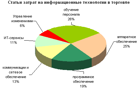 При этом структура расходов на ИТ в торговле за нескольких последних лет практически не изменилась. 39 % от ИТ-бюджетов ритейлеров составляют капитальные затраты — на внедрение информационных систем, покупку лицензий программного обеспечения. 61 % приходится на внедрение и установку различных приложений, адаптирующих приобретенные системы к проблематике конкретного предприятия и текущим задачам. В структуре ИТ-бюджета мирового ритейла, по оценкам Gartner, доминируют расходы на обучение и подготовку персонала — 26 %, покупку аппаратного обеспечения — 25 %, ПО — 19 %. Сравнительно низкими остаются статьи расходов на средства коммуникации и связь — 13 %, ИТ-сервисы — 11 %, средства поддержки антикризисного менеджмента и управления изменениями — 6 %.