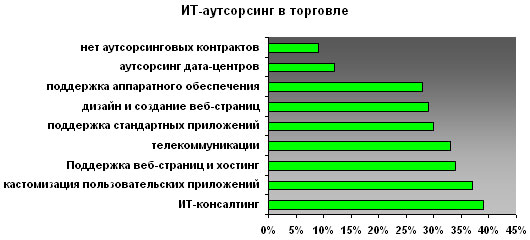 Интересно, что в сфере аутсорсинга информационных систем и корпоративного ПО акцент постепенно смещается от покупки приложений, полностью разрабатываемых под заказчика («ondemand») в сторону покупки стандартизованных приложений и доработки их под задачи заказчика. Особенно всплеск спроса на подобные продукты характерен для средних и умеренно крупных розничных сетей, лидеры отрасли чаще предпочитают программное обеспечение ondemand, что обусловлено как инертностью стратегий в сфере информационных технологий, так и большими финансовыми возможностями. Кроме того, использование систем и приложений ondemand ощутимо снижает риск копирования бизнес-процессов конкурентами. Как указывает Gartner, наиболее популярными стандартизованные приложения являются в таких сферах, как управление цепочками поставок, финансы или коммерческое планирование производства.