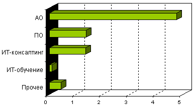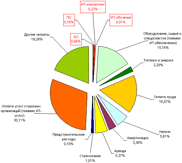 Наиболее крупной статьёй ИТ-расходов в 2004 г. являлось приобретение АО (0,66 %), второе место занимали расходы на ИТ- консалтинг (0,22 %), на третьем месте — расходы на ПО (0,16 %). Самой низкозатратной статьей было ИТ-обучение сотрудников.