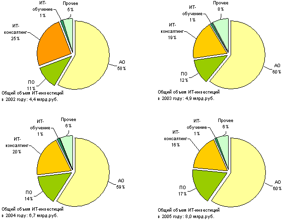 Так, например, в 2003 году затраты на ИТ-услуги резко сократились — против 35 %-ного роста годом ранее. Затраты на ИТ-обучение лишь составили 98 %, т.е. сократились на 2 %. Тоже самое произошло с расходами на ИТ-консалтинг, где сокращение было ещё более ощутимо — затраты снизились почти на 17 %. В следующем же году темпы не просто вышли на прежний уровень, но в разы его превзошли — в 2004 году рост затрат на ИТ-консалтинг составил 42 %, на ИТ-обучение — 66 %. В том же 2004 году расходы на АО вдруг вышли на 31 % прироста против 17 % годом ранее. Поскольку такая крупная статья, как расходы на закупку АО (порядка 60 % всех затрат), меняется хоть и неустойчиво, но зато всегда в сторону возрастания, отмеченные аномалии не отразились на средних темпах роста общих ИТ-расходов отрасли.