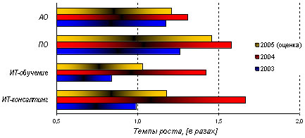 В результате, после отмеченного спада и последующего «взрыва» ИТ-расходов, выход ИТ-потребления в 2005 году на сглаженные темпы роста (21 % прироста — АО, 45 % — ПО, 18 % — ИТ-услуги), выглядят вполне естественным. Однако о начавшемся остывании —либо, напротив, о скором новом «разогреве» рынка — говорить на данный момент не представляется возможным. Могут обсуждаться лишь альтернативные и, при этом, равновероятные, сценария развития.