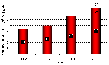На основе анализа динамики ИТ-затрат, даваемых Росстатом, по итогам 2005 года их объем в отрасли может быть оценен на уровне 8 млрд.руб. Сразу стоит отметить, что эти данные почти в 2 раза расходятся с данными Gartner, по которым ИТ-затраты торговых предприятий в 2005 году составили $593 млн. (т.е. порядка 16 млрд.руб.). Не считая $66 млн., приходящихся на рестораны и отели, которые в выборке Росстата отсутствуют. При этом оценки Gartner даны только для розницы, а в выборку Росстата включены также предприятия оптовой торговли