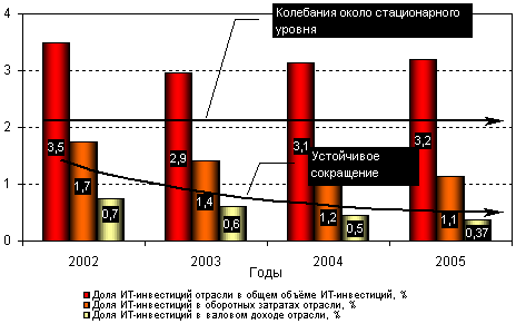 Не стоит преувеличивать также и перспективу роста ИТ-расходов в торговле опережающими темпами по сравнению с другими статьями расходами. Анализ рядов динамики показывает, что доля ИТ-затрат как в оборотных затратах, так и в валовом доходе отрасли неуклонно сокращается от года к году. По итогам 2005 г. доля ИТ-затрат в общем объеме затрат составила чуть более 1 %, сократившись за четыре года в 1,5 раза. Их доля в валовом доходе составила 0,4 %, за четыре года, сократившись в 1,75 раза. И вряд ли в ближайшее время динамика изменится.